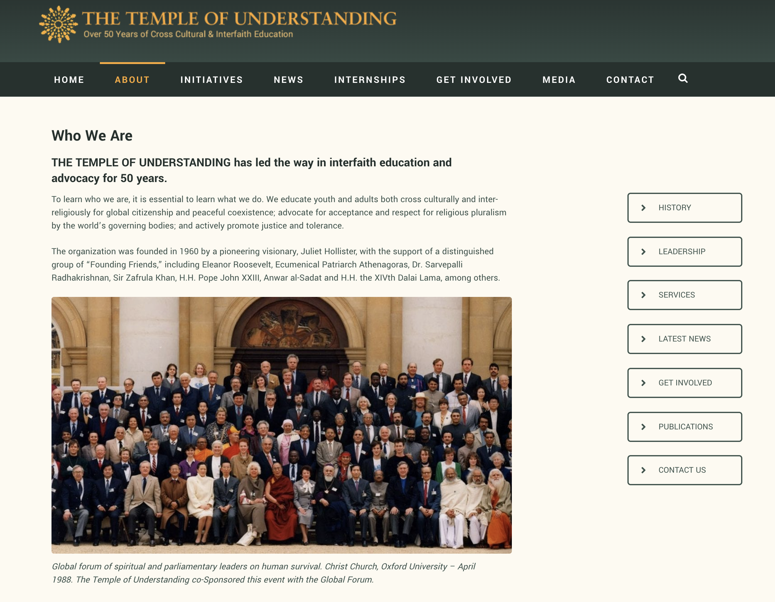 '이해의 사원'은 국제연합의 권한을 위임받은 국제연합의 ‘영적 파트’를 담당하는 핵심 NGO 기구이기도 하며, ‘국제연합 국제고문위원회(UN’s Global Forum councils)’의 위원 12명이 사원의 담당 및 고문을 지냈습니다. '이해의 사원'과 연관된 지식인들과 전문인들을 모두가 하나 같이 범신론과 이신론을 지지하며, 포스트모던 시대의 뉴에이지를 강조했습니다.